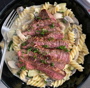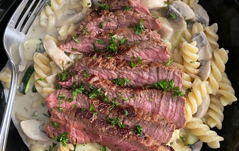 Schnelles Luxusgericht: Zarte Rinderstreifen auf Pasta mit cremiger Pilzrahmsauce